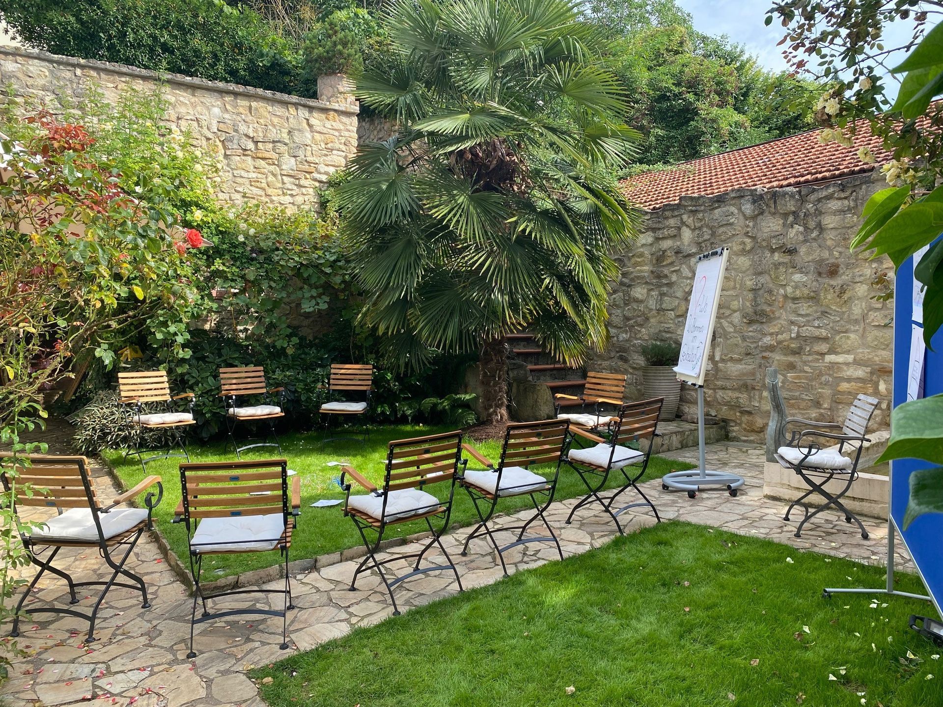 Die Veranstaltungen können im Kaminzimmer, in der Scheune, im Gewölbekeller oder auch in den Gartenbereichen stattfinden, gerne auch hybrid mit zugeschalteten Teilnehmern.